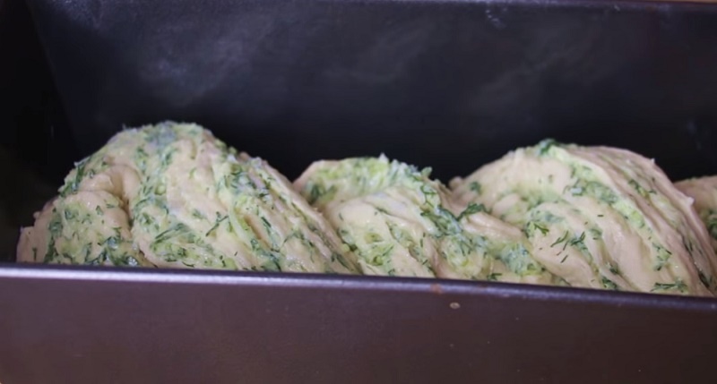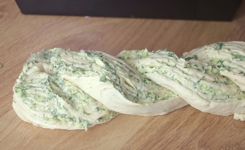 Po godzinie wyjmij ciasto, rozwałkuj je na cienką warstwę i posmaruj stworzonym nadzieniem koperkowym. Zwiń ciasto na rolkę, przetnij wzdłuż na dwie części i z tego zrób „warkocz”.