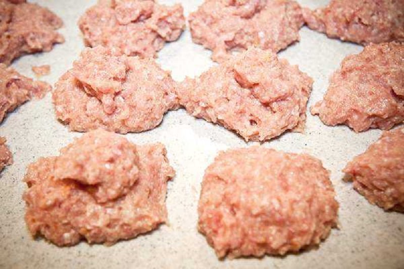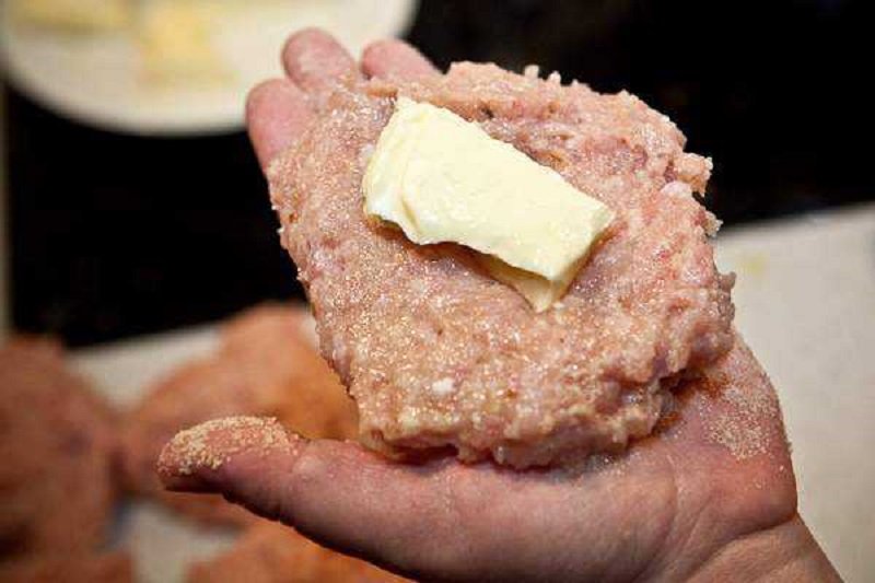 Trzymając jeden kawałek mięsa w dłoni, nadaj mu kształt placka, a na jego środku połóż masło.