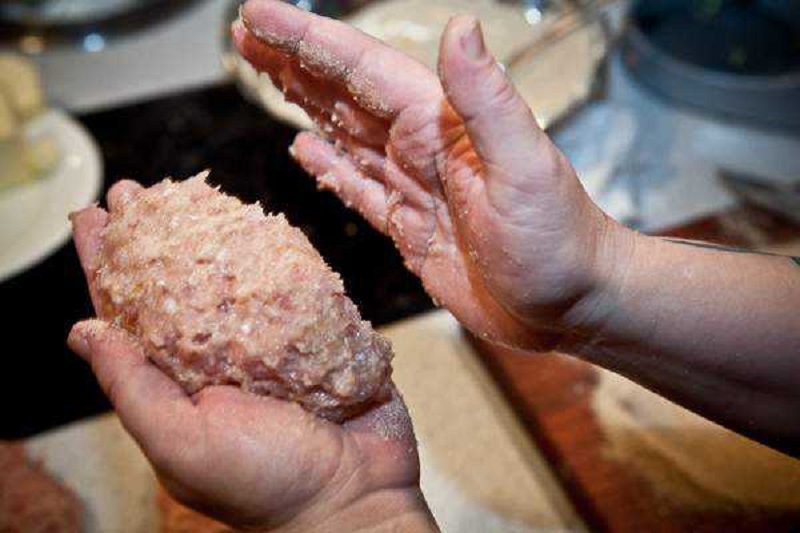 Teraz połącz ze sobą krawędzie mięsnej masy, tworząc kotleta. Masło powinno być całkowicie zakryte przez mięso.