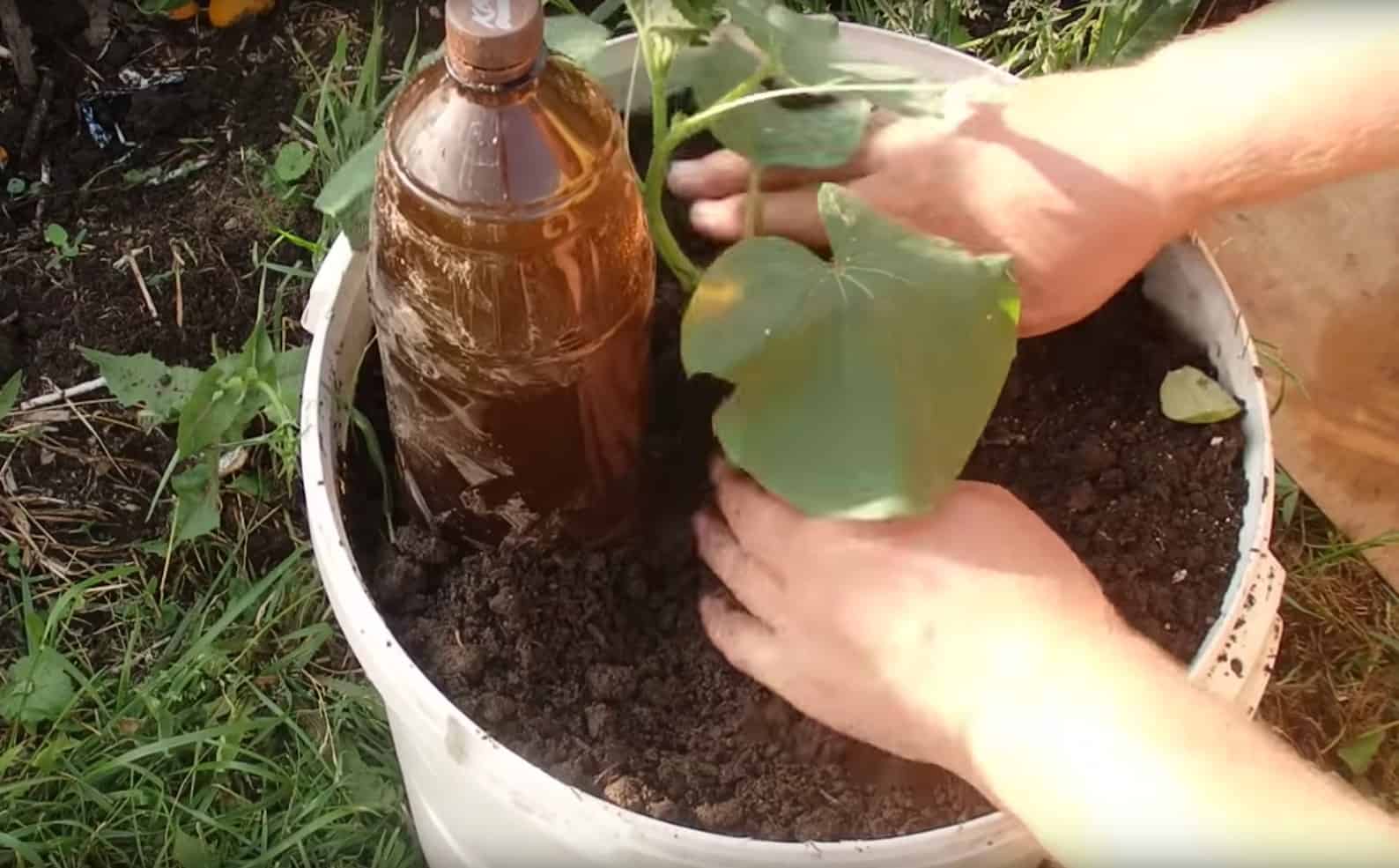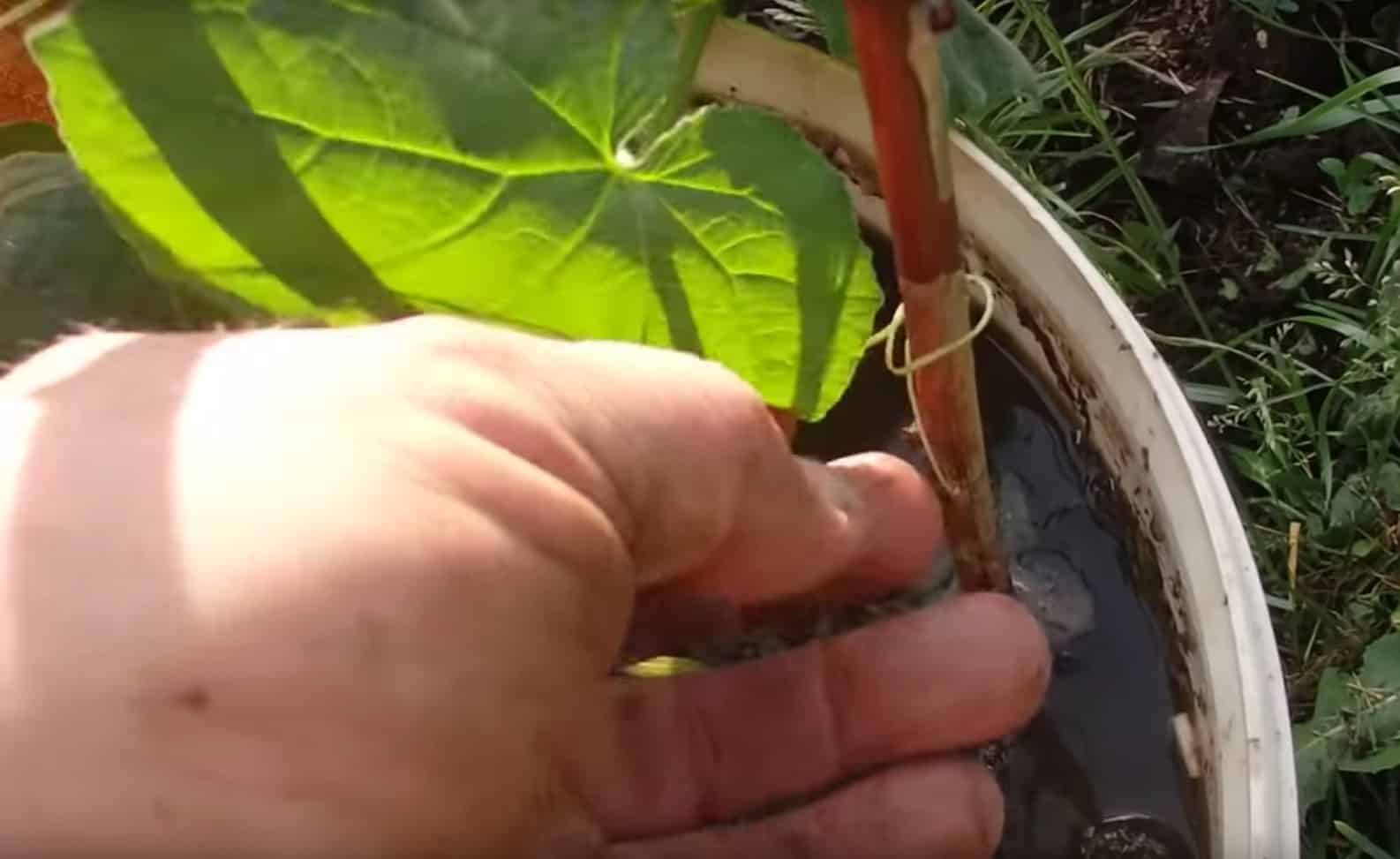 Gdy po 1 podlaniu woda zostanie wsiąknięta, należy podlać roślinę po raz drugi nieco ponad powierzchnię ziemi. Ostatnim etapem jest owinięcie wąsami patyków a po drugim wsiąknięciu wody dołożenie ziemi do wiadra.