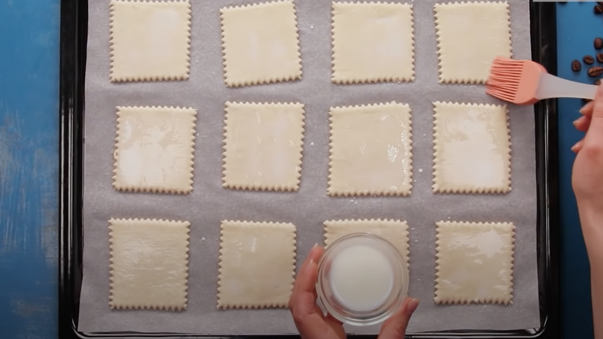 Ciasto francuskie należy rozwinąć z opakowania, a następnie pokroić je na kwadraty.