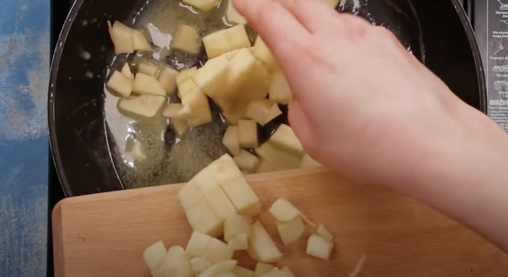 W tym celu należy rozpuścić na patelni masło, dodać pokrojone w kostkę jabłka, cynamon, cukier i wymieszać.