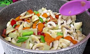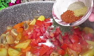 Oczyść cebulę i marchewkę. Posiekaj paprykę, cebulę i marchew dość grubo. Ziemniaki i pomidory pokrój w drobną kostkę. Pieczarki pokrój w plasterki. Weź rondel lub głęboką patelnię. Rozgrzej na niej trzy łyżki oleju, następnie dodaj marchew i cebulę. Poczekaj, aż cebula się zeszkli, dodaj paprykę czerwoną i zieloną. Podgrzej przez chwilę, mieszając, a potem dodaj pieczarki.