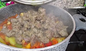 Teraz dopiero dodaj ugotowane i pokrojone na kawałeczki mięso, zalej wszystko wodą i pozostaw do zagotowania. Danie będzie gotowe, gdy wszystkie warzywa będą miękkie, pomidory rozpadną się, a sos nieco zgęstnieje. Zdejmij patelnię ub rondel z ognia, odstaw na kilka minut, niech wszystkie smaki połączą się.