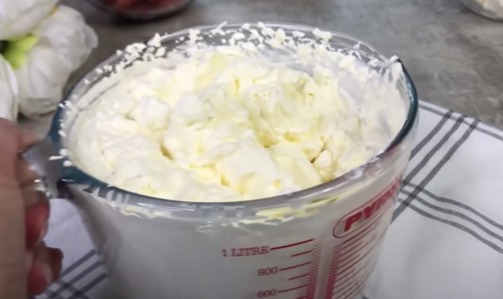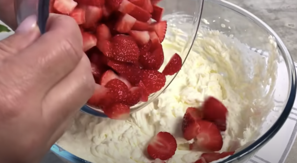 Na czas oczekiwania obierz i umyj truskawki. Kiedy skończysz, dodaj truskawki do śmietany.