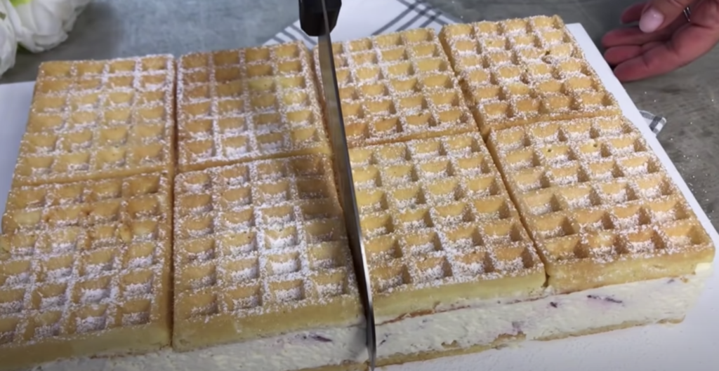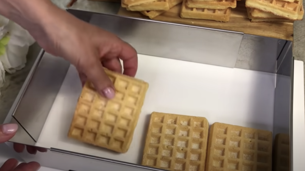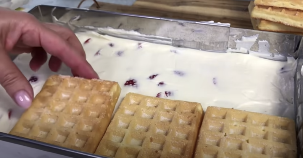 Włóż gofry do naczynia do zapiekania. Na wierzch wylej śmietanę.