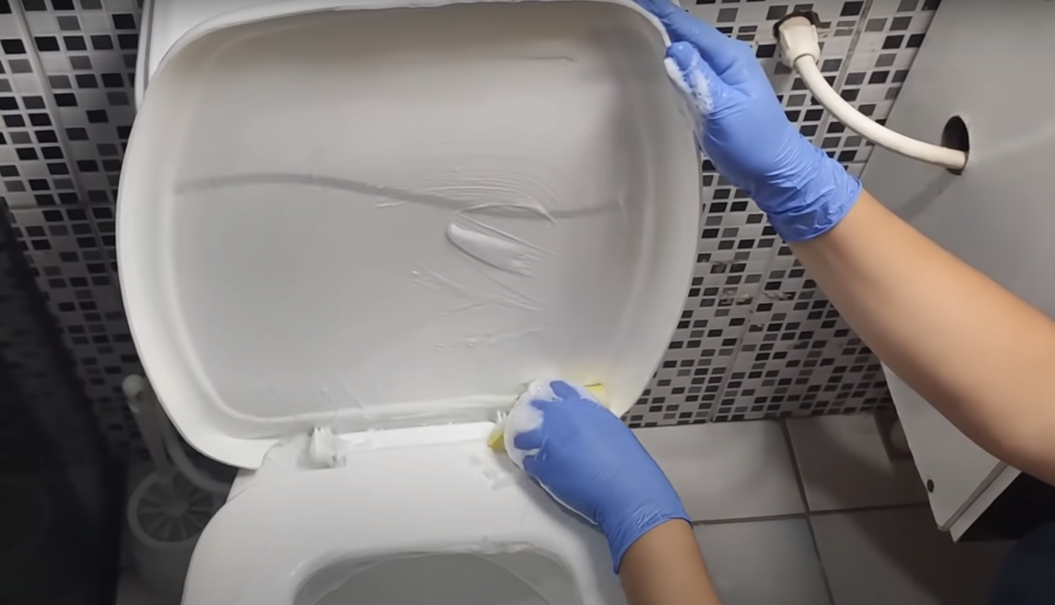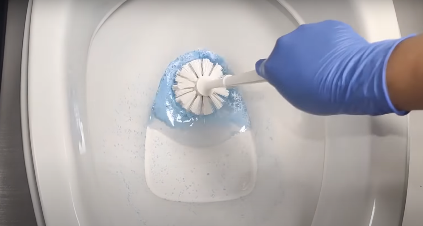 Gdy zawartość naszej miski z mieszanką znajdzie się w toalecie należy za pomocą szczotki do WC wyszorować powierzchnię toalety. A następnie całość za pomocą gąbki ruchami ku górze dodatkowo czyścimy toaletę.