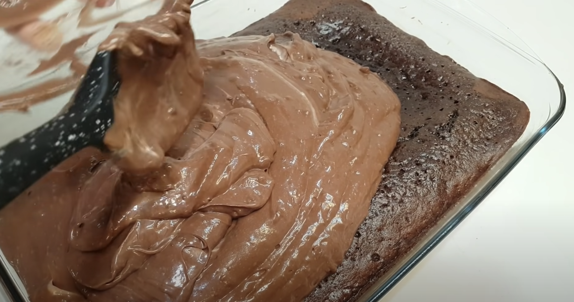 Czekoladę rozpuść w kąpieli wodnej i odstaw do lekkiego ostygnięcia, następnie wymieszaj ze śmietaną. Wylej polewę na wierzch ciasta, równo ją rozsmarowując. Jeśli jesteś fanem czekolady, posyp wypiek tartą czekoladą.