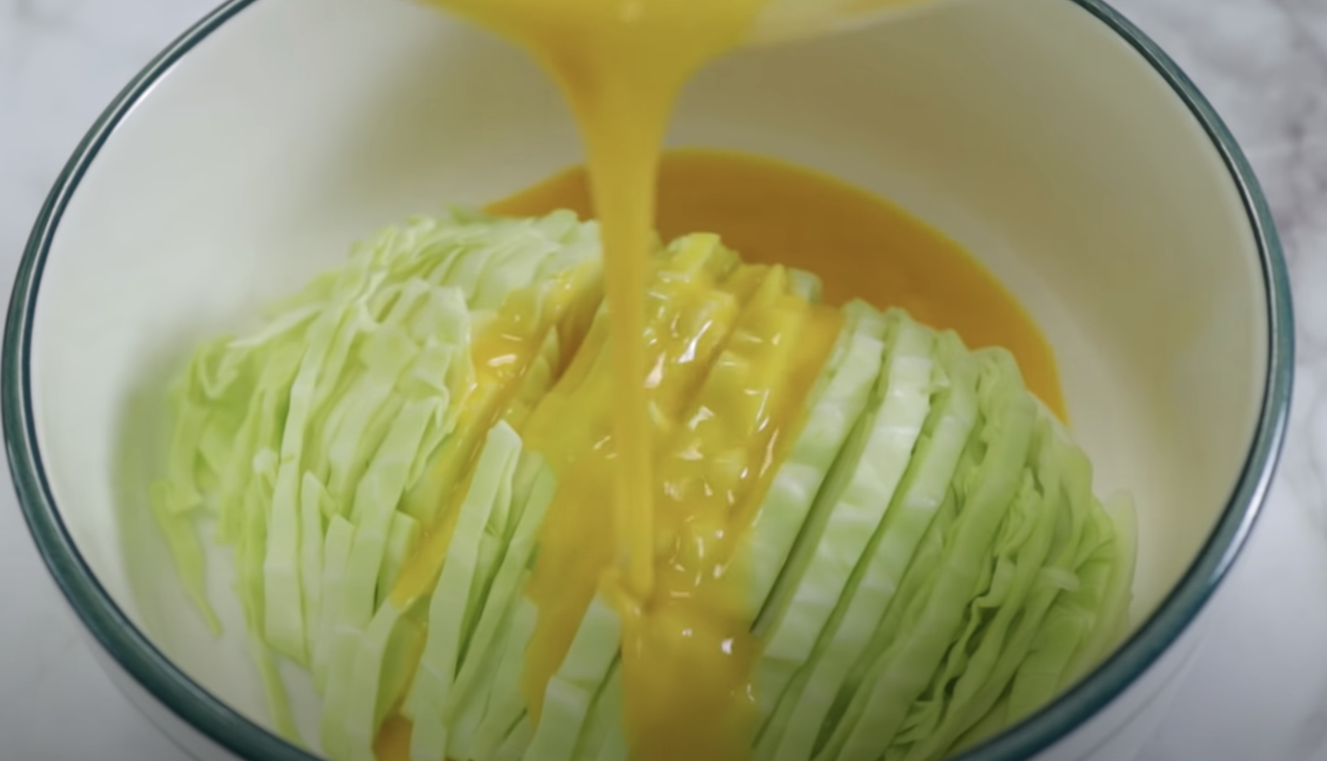 W osobnej misce, ubij 2 jajka z przyprawami. Następnie dodaj do nich kapustę. Rozgrzej patelnię i dodaj 2 łyżki oleju. Wyłóż na nią masę z kapusty i jajek, tworząc jednolity placek.