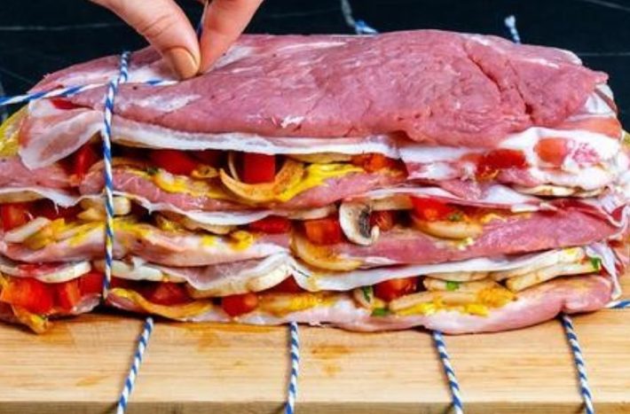 Rozłóż musztardę na kawałku mięsa. Połóż na nim jedną trzecią mieszanki cebuli, pomidorów i pieczarek, jedną trzecią plastrów bekonu i przykryj wszystko drugim plasterkiem mięsa. Powtórzyć z kolejną trzecią składników, dodać kolejny kawałek mięsa, resztę składników i przykryć ostatnim kawałkiem karkówki. Następnie mocno zawiąż sznurki.