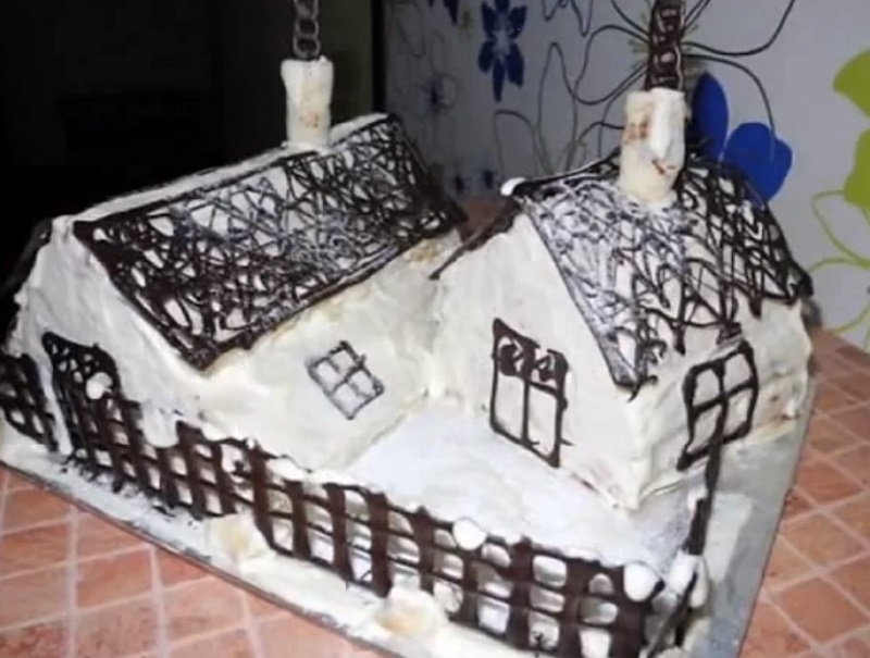 Utrzyj białka i 150 gramów cukru, gdy piana jest już sztywna dekoruj nią boki chaty. Mocno przykryj całą chatkę. Posyp startą czekoladą na wierzchu.