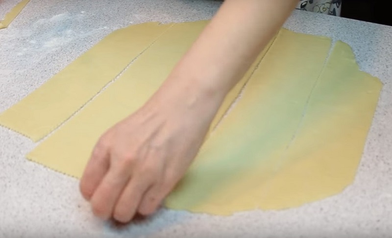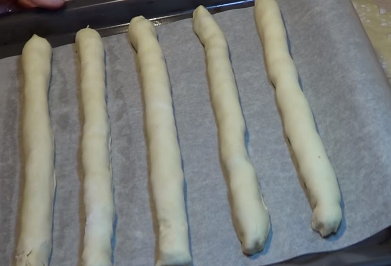Wyjmij kule z lodówki i rozwałkuj je za każdym razem, aby uzyskać pasek o długości 20-25 cm i szerokości 3-4 cm.