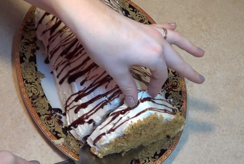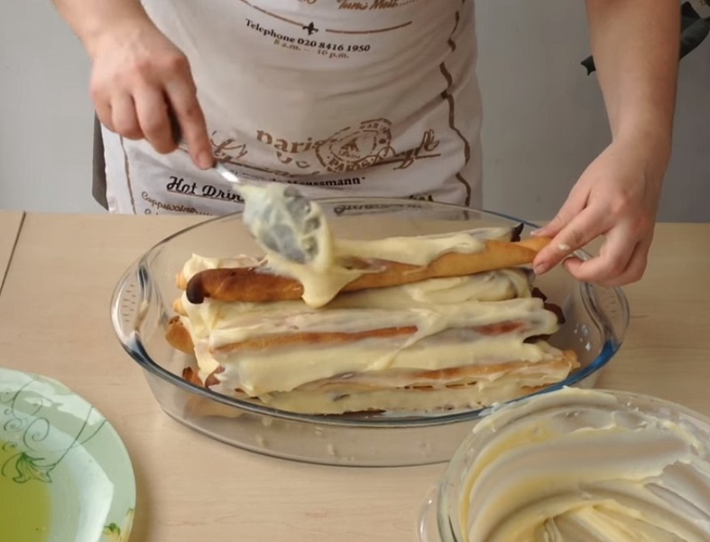 Pozostaje już tylko zrobić krem. Wyłóż kwaśną śmietanę na gazę, która przykrywa durszlak i pozostaw na 5-6 godzin w zimnym miejscu, aby usunąć nadmiar serwatki. Ubij śmietanę z cukrem. Weź dużą formę, teraz możesz zacząć budować chatkę. Ułóż pierwszą warstwę 7 rurek z różnymi nadzieniami i przykryj je kremem.