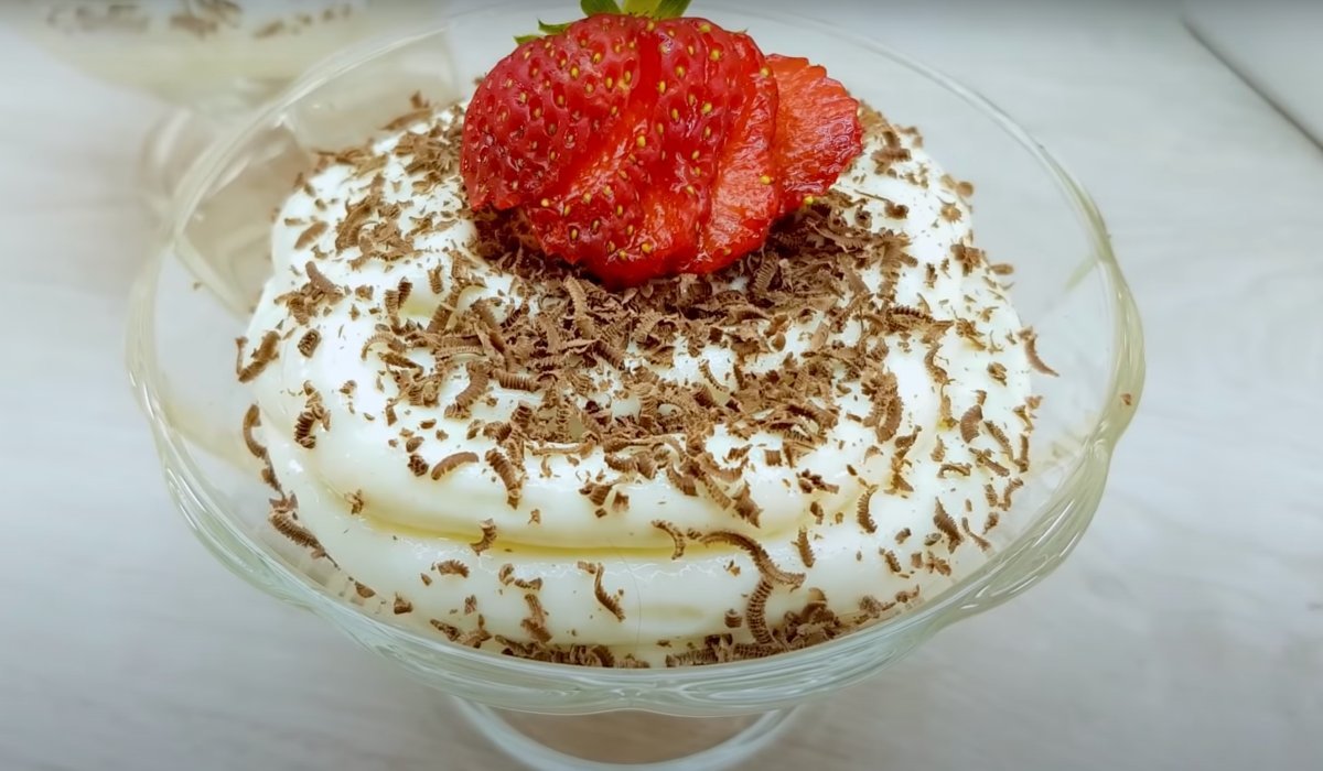 Krem jest gotowy! Podawaj w miseczkach z ulubionymi dodatkami. Radzę spróbować położyć okruchy ciastek na dno naczynia, a następnie kilka łyżek kremu. Udekoruj startą czekoladą i truskawkami lub skórką z cytryny.