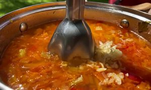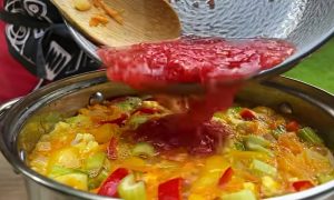 Podczas gotowania dodajemy miąższ pomidora starty na tarce (pozbywamy się skórki) do zupy. Kontynuujemy gotowanie, aż wszystkie składniki się połączą.