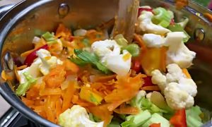 Wtedy dodajemy paski papryk i mieszamy je z resztą składników. Gdy papryki się zeszkliją, wprowadzamy pokrojony seler naciowy i różyczki kalafiora.