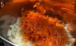 Dodajemy startą marchew po zeszkleniu cebuli i kontynuujemy smażenie, aż warzywa zmiękną.