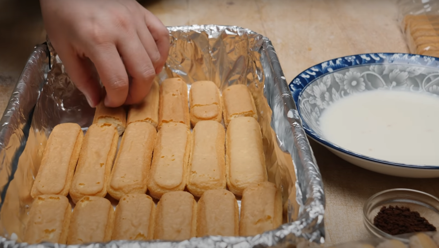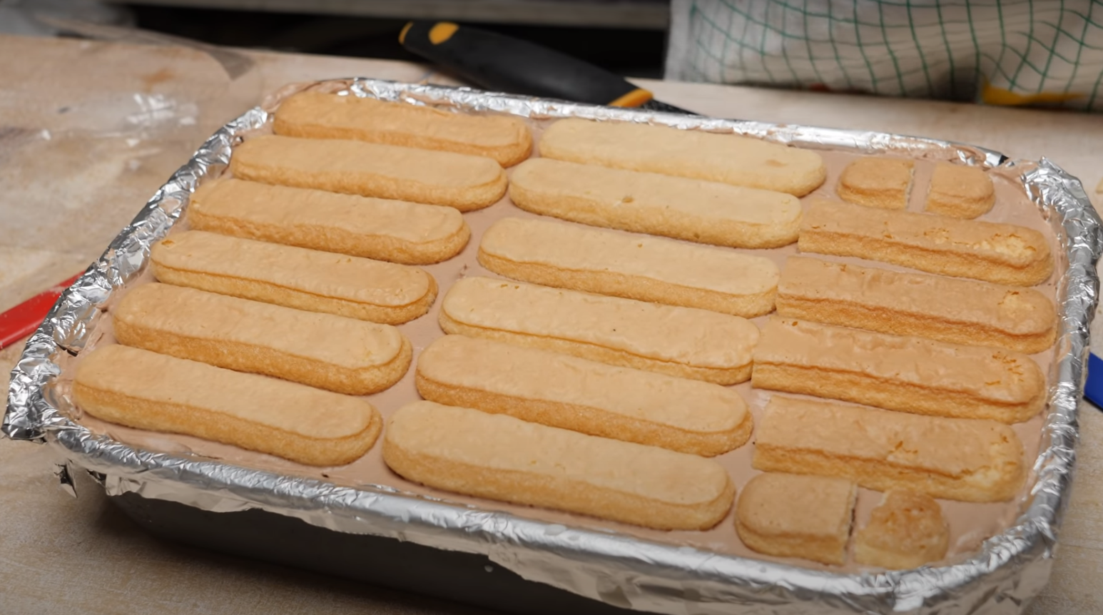 Po skończeniu pierwszej warstwy biszkoptów, nałóż na nie część kremu i wygładź powierzchnię. Na warstwę śmietanki ponownie ułóż kolejne biszkopty i ponownie rozprowadź krem ​​na wierzchu. Ostatnią warstwą muszą być biszkopty.
