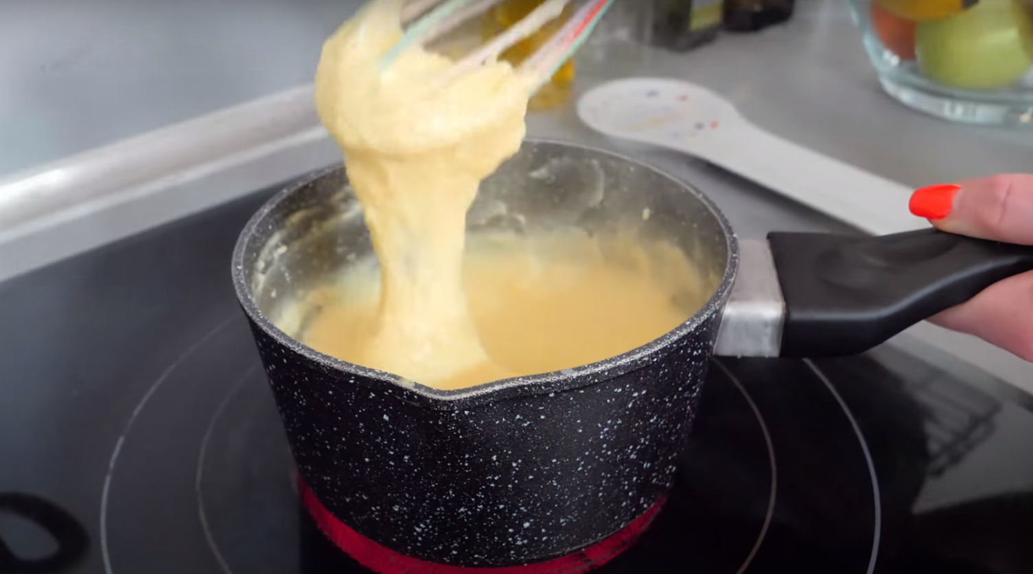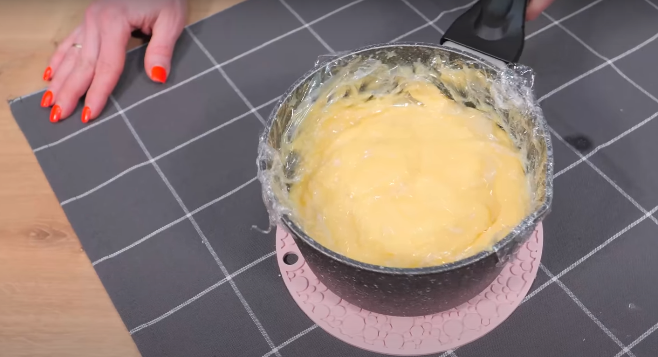 W czasie kiedy ciasto się piecze, zacznij robić krem. Żółtka utrzyj z cukrem i cukrem waniliowym. Kiedy cukier dobrze się rozpuści, dodaj także skrobię i mieszaj do pozbycia się grudek. W garnku podgrzej mleko, wlej do niego powstałą mieszankę i zagotuj, ciągle mieszając.