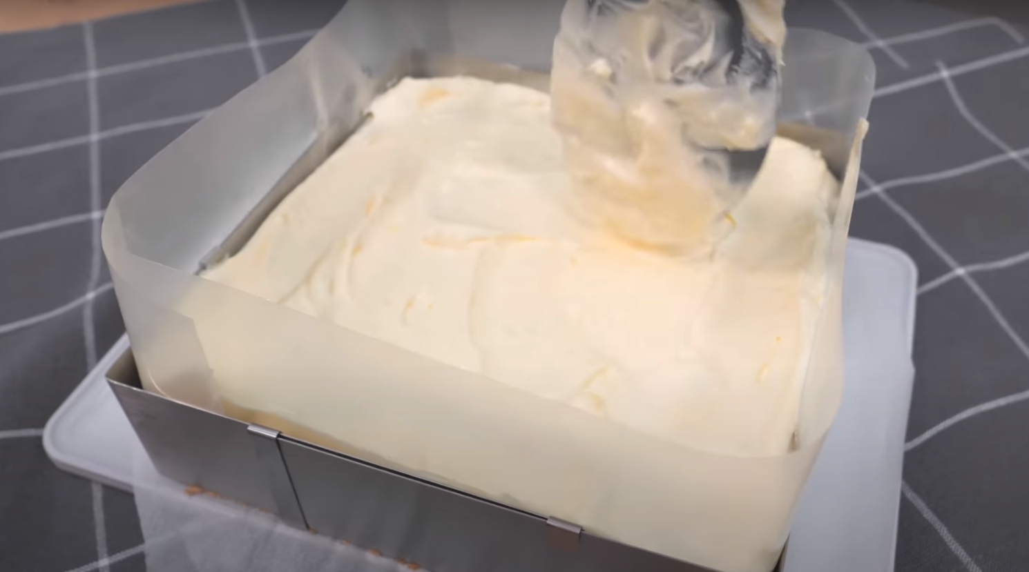 Upieczone ciasto wyjmij z piekarnika, ostudź i oddziel brzegi od formy. Ubij schłodzoną śmietankę 30%, wymieszaj z zimnym kremem i wyłóż równomiernie na cieście.