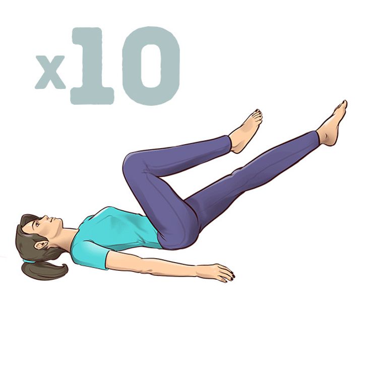 Metoda 2: Leżąc, unieś nogi i na przemian zginaj je w kolanach, imitując jazdę na rowerze. Powtórz 10 razy na każdą nogę.