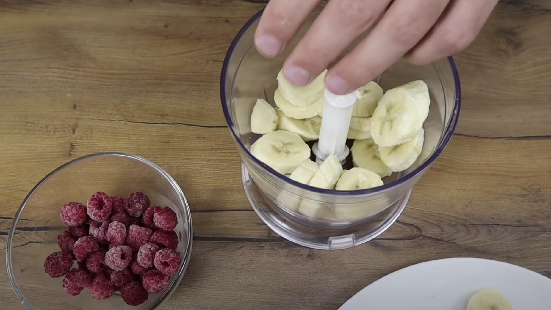 Zmiksuj banana z kilkoma kawałkami mrożonych malin. Wkładamy do miksera.