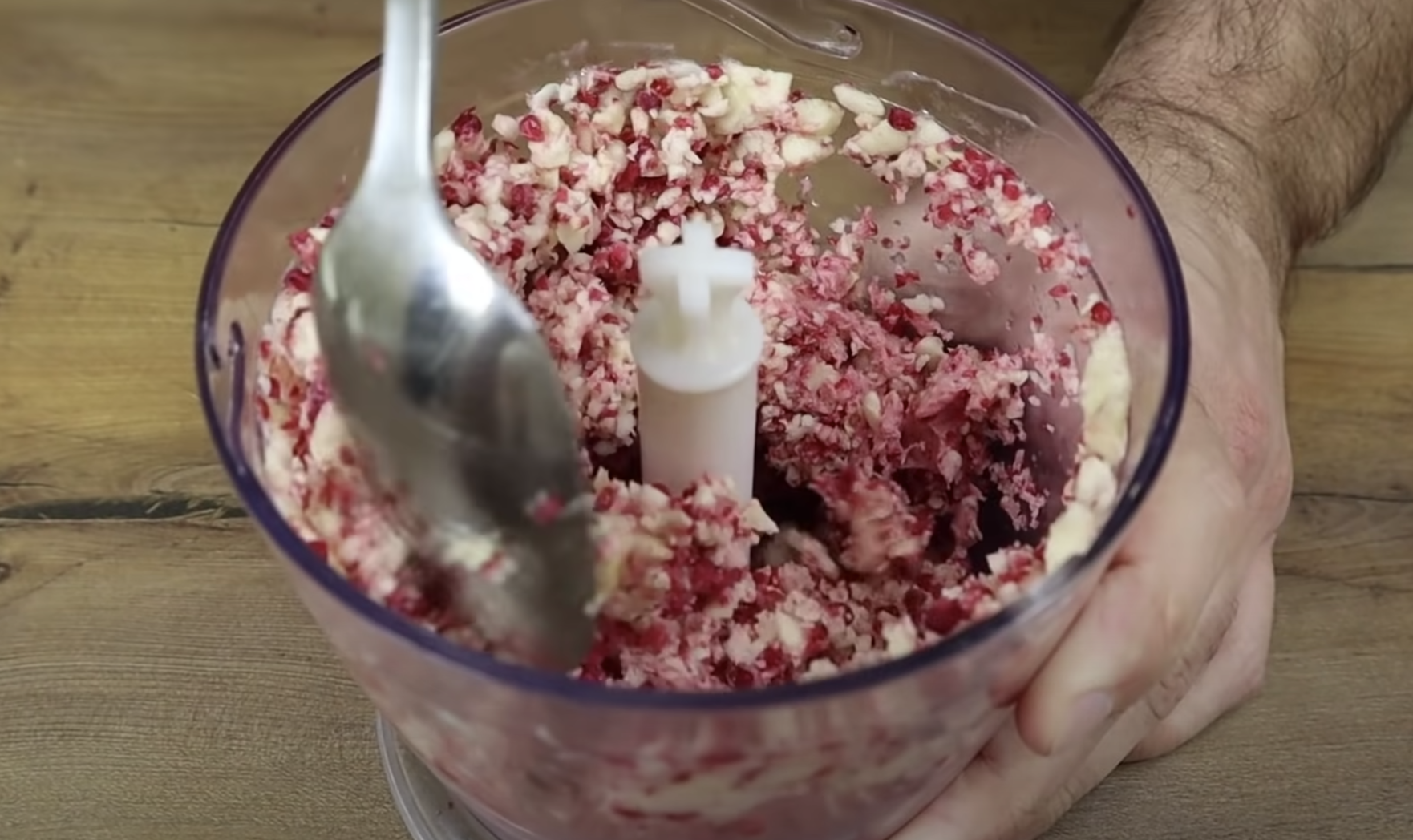 Mieszamy, aż powstanie jednolita masa. Najpierw widzimy, że w mieszance są kawałki bananów i malin .