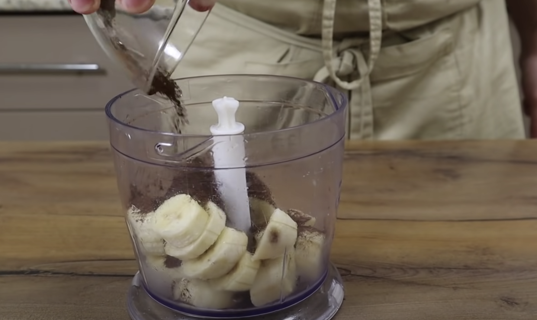 Wymieszaj banana z 2 łyżkami kakao. Mieszamy do uzyskania kremowej konsystencji.