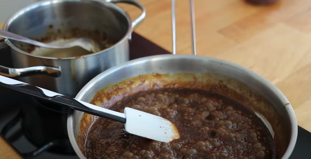 Gdy masa zgęstnieje, odstaw ją do ostygnięcia. W garnku wymieszaj 90 g cukru z 2 łyżkami wody i podgrzewaj, aż cukier się rozpuści. W osobnym garnku podgrzej 150 ml śmietanki, dodaj kawę rozpuszczalną i mieszaj, aż kawa się rozpuści. Połącz kawową śmietankę z rozpuszczonym cukrem, dodaj szczyptę soli, masło i aromat rumowy. Wymieszaj dokładnie.