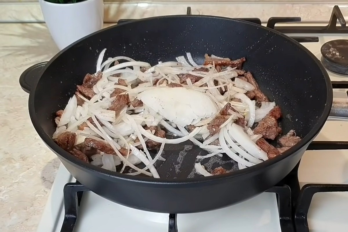 Do wołowiny dodaj cebulę, posiekaną na półpierścienie i smaż, aż będzie przezroczysta, od czasu do czasu mieszając.