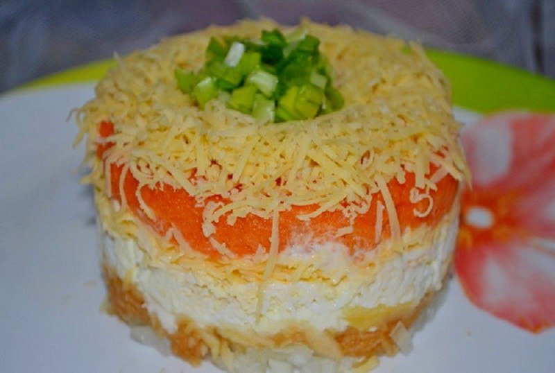 Marchewki i jabłka obierz. Zetrzyj na tarce. Jajka i ser drobno posiekaj lub zetrzyj. Cebulę posiekaj, przelej wrzątkiem, zanurz w zimnej wodzie na 3 minuty. Odsącz na sicie. Marchewkę wymieszaj z przepuszczonym przez praskę czosnkiem. Sałatkę układaj warstwami w następującej kolejności: cebula, jabłko, jajko, marchew z czosnkiem, ser. Powtórz warstwy.