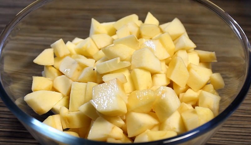 Jabłka myjemy, obieramy i kroimy na małe kawałki. Skrapiamy je sokiem z cytryny, aby nie zmieniły koloru.
