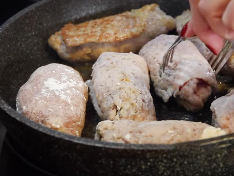 Mięso smażymy do złocistego koloru. Sos: Resztę cebuli kroimy na bardzo drobno i smażymy na głębokiej patelni. Dodajemy paprykę mieloną, mąkę, śmietanę i niedużą ilość wody. Poszatkowany koper dodajemy na samym końcu. Do gotowego sosu wkładamy zrazy.