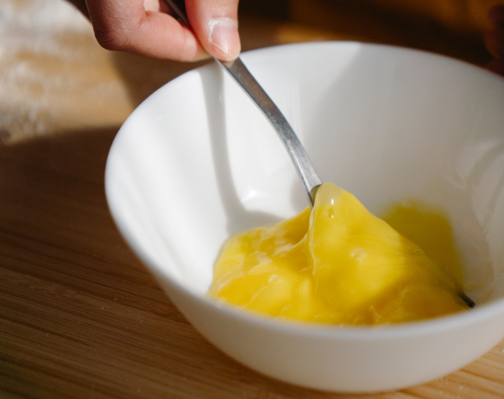 Dodaj jajka i sól do miski. Wymieszaj mikserem.
