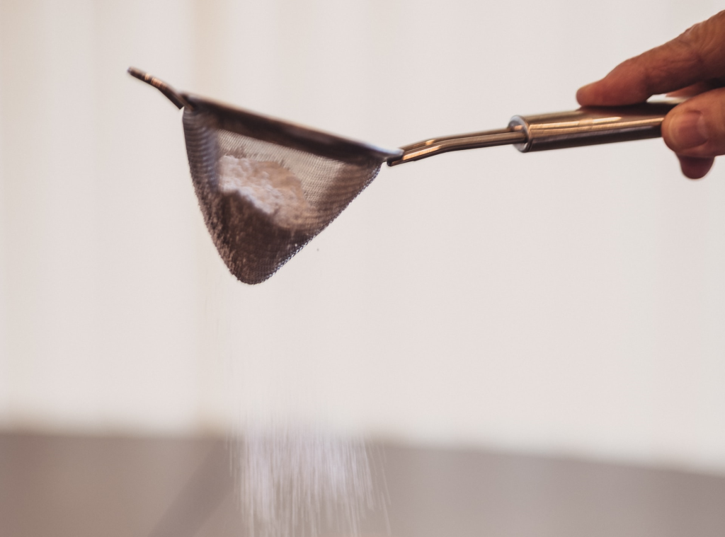 Stopniowo dodawać cukier podczas ubijania. Do mieszanki przesiać mąkę i proszek do pieczenia. Dokładnie wymieszaj trzepaczką.