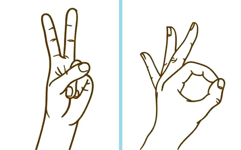 Prawą ręką wykonaj gest zwycięstwa („V”),natomiast lewą gest „OK”. Szybko zamieć ręce i prawą dłonią wykonaj znak „OK”, a lewą „V”. Powtarzaj ćwiczenie kilkakrotnie.
