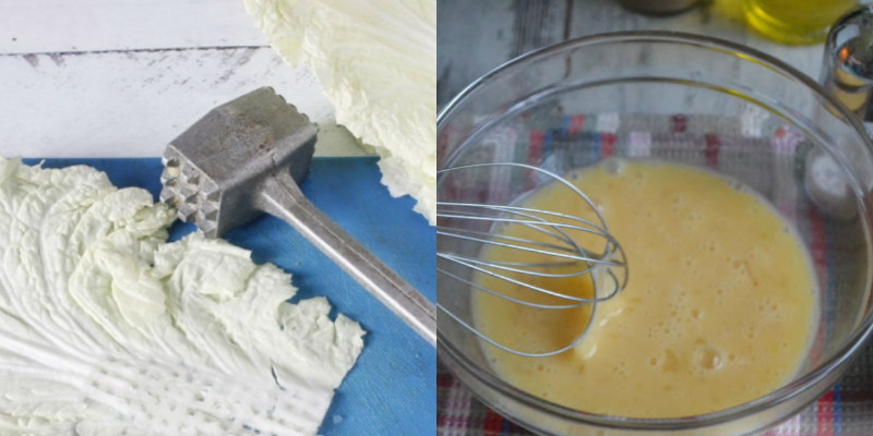 Jajka wbij do miski, dopraw solą i pieprzem, a następnie dokładnie wymieszaj. Do jajek dodaj mąkę i dokładnie połącz w gładką masę. Rozdziel liście kapusty pekińskiej usuwając głąb. Liście rozbij tłuczkiem do mięsa.