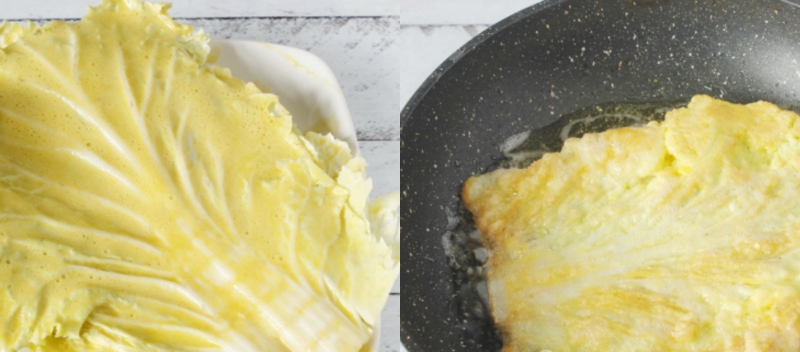 Na patelni rozgrzej 2 łyżki oleju. Liście kapusty pekińskiej mocz w powstałej, jajecznej masie, a następnie smaż z obu stron przez około minutę. Usmażone liście przekładaj na talerz wyłożony ręcznikiem kuchennym. Dzięki temu papierowy ręcznik wchłonie nadmiar tłuszczu.