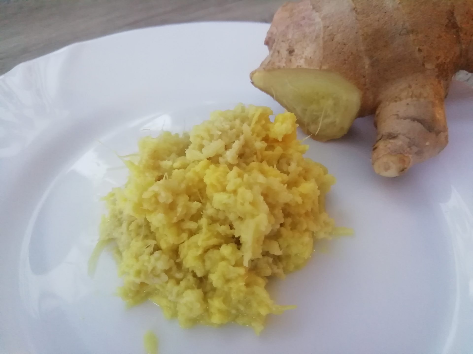 Kawałek korzenia imbiru dokładnie oczyść ze skórki i zetrzyj na tarce o drobnych oczkach.