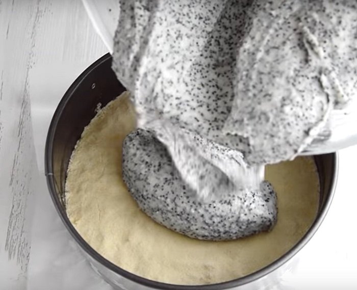 Następnie na jej powierzchni rozprowadź masę twarogowo-makową. Drugą połową kruchego ciasta posyp nadzienie wylane do formy. Staraj się rozsypać ciasto równomiernie po powierzchni formy.
