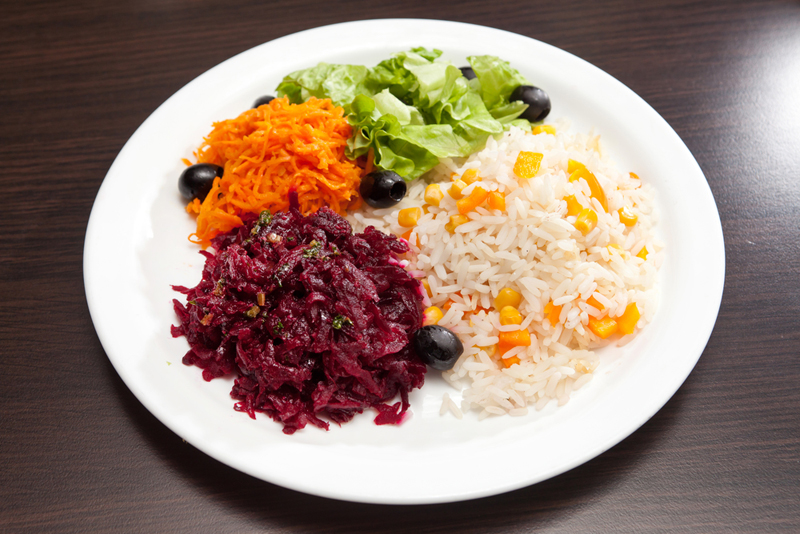Buraki i marchew zetrzeć na tarce. Wymieszać ryż z kukurydzą. Na talerzu oddzielnie umieścić warzywa, oliwki oraz ryż. Sos sojowy wymieszać z oliwą z oliwek i octem. Polać całość. Przed spożyciem wymieszać na talerzu wszystkie składniki.