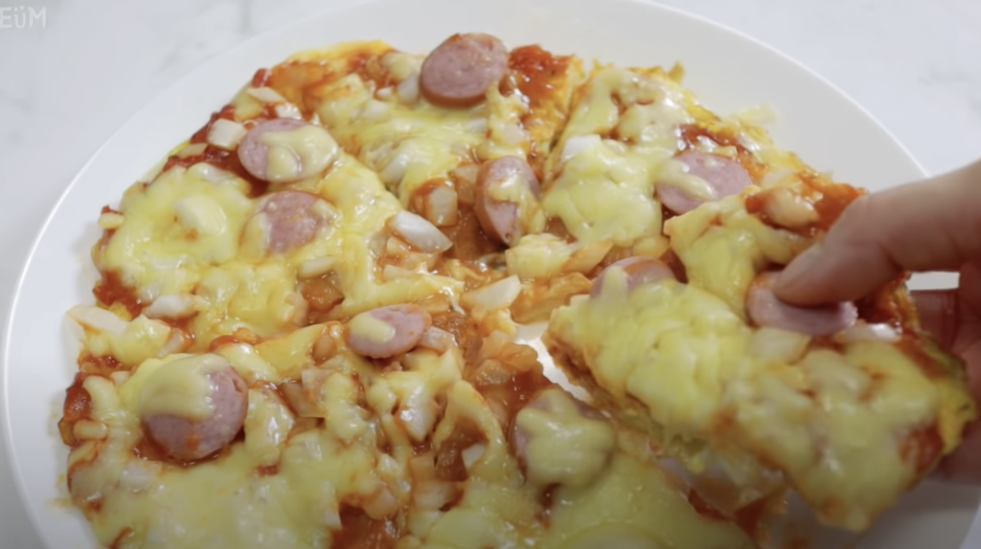 Odwracamy na drugą stronę, pomagając sobie talerzem. Wykładamy sos pomidorowy, posypujemy cebulą, wykładamy ser i kiełbasę. Przekładamy na patelnię i podgrzewamy do czasu, aż ser się rozpuści.