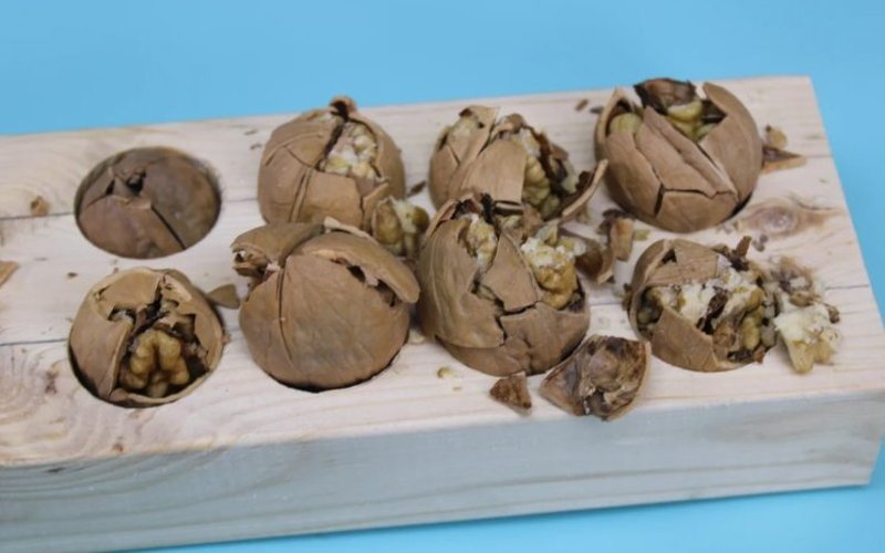 Umieść orzechy w otworach (ostrą stroną do góry!) i łam delikatnie młotkiem.