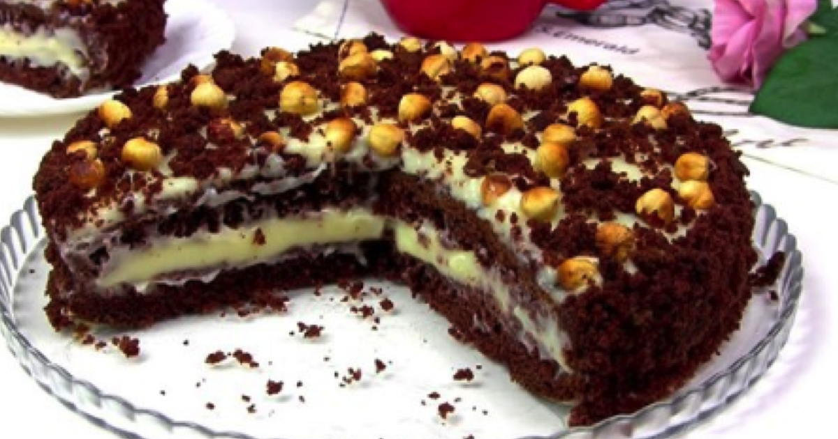 Po wystudzeniu ciasta, odcinamy z niego nierówną cienką warstwę, a resztę przekrawamy na dwie części. Na jednej rozsmarowujemy krem, przykrywając drugą częścią. Odkrojoną część mielimy i obsypujemy nią boki oraz wierzch ciasta po ponownym posmarowaniu kremem.