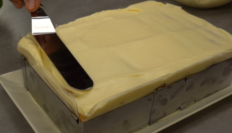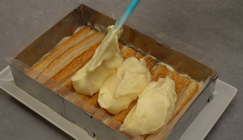 Krem rozprowadzamy w formie. Nakrywamy go gotowymi paskami ciasta francuskiego. Następnie wykładamy kolejną warstwę kremu.