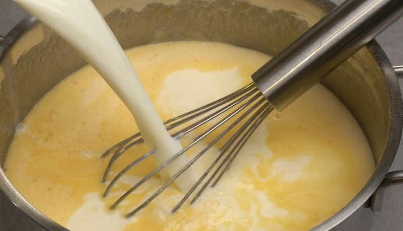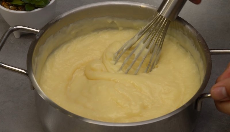 Wbijamy jajka na patelnię, dodajemy cukier, mąkę, skrobię kukurydzianą i cukier waniliowy. Dokładnie wymieszaj wszystkie składniki trzepaczką. Dodaj mleko i ponownie wymieszaj. Gotuj na średnim ogniu, cały czas mieszając, aż zgęstnieje.