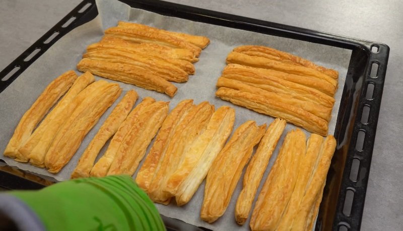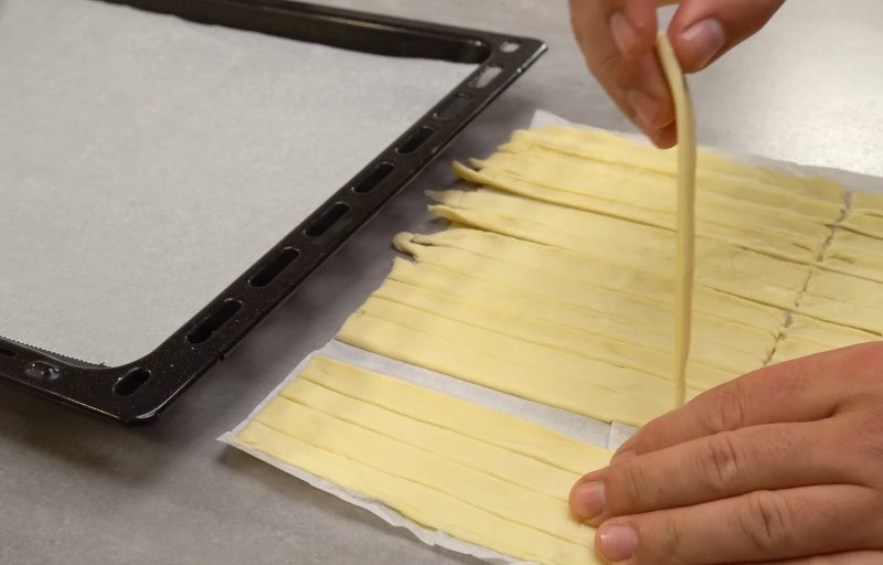 Ciasto francuskie pokrój w paski o szerokości półtora centymetra.