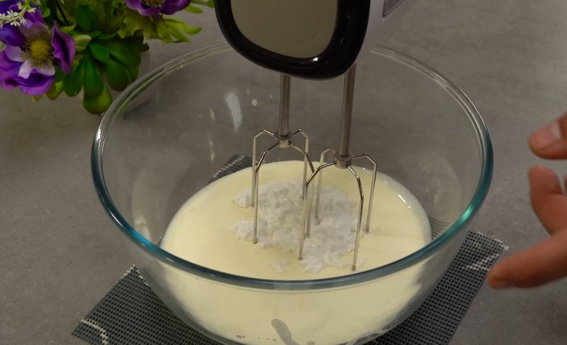 Do miski wlej śmietanę (33–36% tłuszczu), dodaj cukier puder i ubij mikserem.
