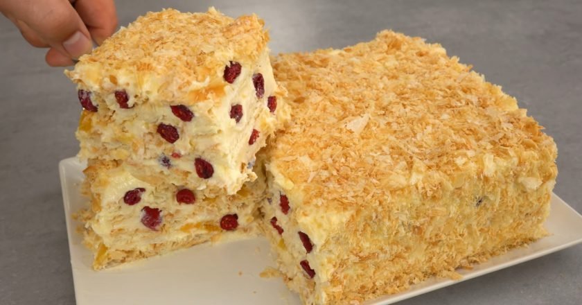 To ciasto daje niezapomniane doznania smakowe, ponieważ jest takie miękkie i słodkie. A dziś jestem gotowa podzielić się przepisem na jego cudowną wariację. Daję gwarancję: „Napoleon” z suszoną morelą i suszoną żurawiną zaskoczy Cię ekstrawagancją smaku.