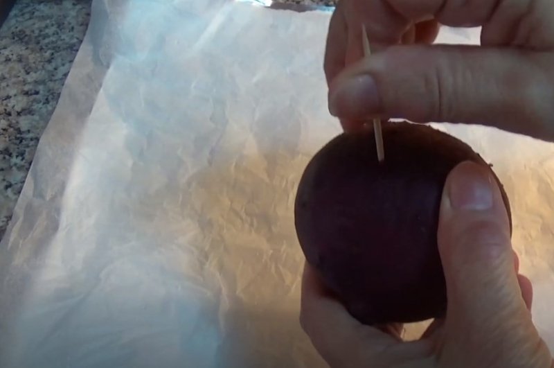 Przed włożeniem do piekarnika zrób w każdym buraku kilka dziur przy pomocy wykałaczki. Potem rozłóż na blaszce do pieczenia wyłożonej papierem do pieczenia nasączonym lekko wodą.